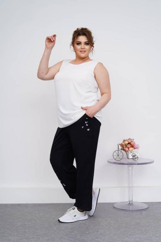 На одном бедре сбоку и на одной брюки декор в виде прорезиненного термопринта "бабочки"