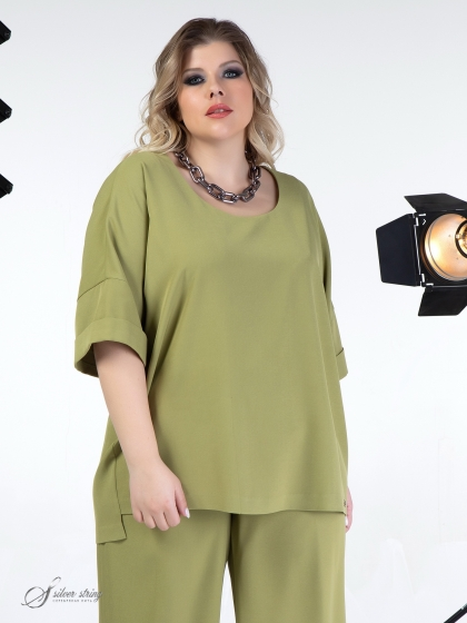 Элегантный блузон Т-образного силуэта выполнен из высококачественного материала с эластаном. Изделие с рукавом покроя кимоно, длиной 3/4. Низ рукава оформлен отворотом. Линия горловины округлой формы. Низ изделия асимметричной формы: спинка удлинена относительно полочки. В модели учтены особенности фигуры дам нестандартных размеров.