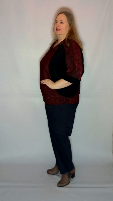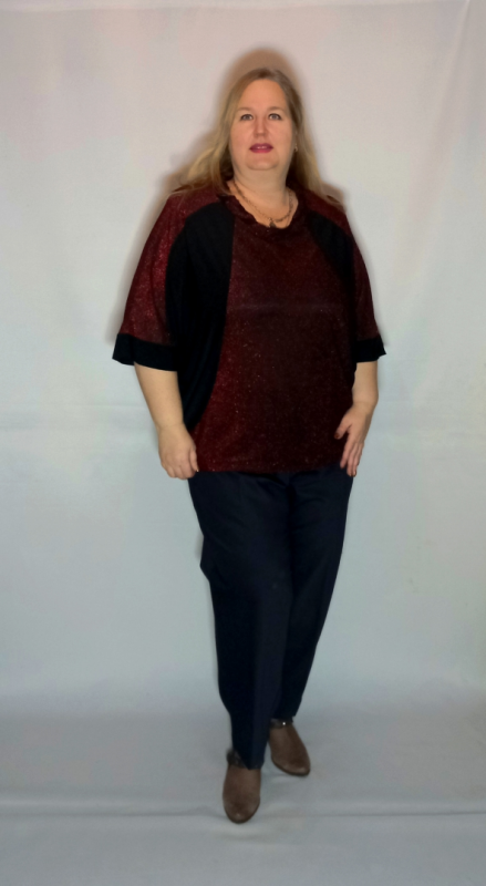 Нарядный блузон выполнен из сочетания двух видов трикотажа: черного однотонного и  трикотажа с люрексом. Трикотаж не осыпается (  нить). Трикотаж средней плотности, эластичный, приятный  к телу.