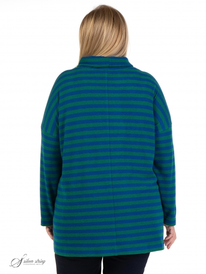 Современный джемпер свободного силуэта выполнен из мягкого трикотажного полотна с рисунком в полоску. Модель с удлиненной линией плеча и воротником - «гольф». Рукав длинный, суженный к низу. Полочка декорирована вертикальной принтованной надписью. При изготовлении принта используется специальный пластификатор, который позволяет рисунку выдерживать длительную эксплуатацию изделия. Модель с асимметричной линией низа: правая сторона полочки укорочена относительно остальных деталей. Такой крой отлично маскирует проблемные зоны, стройнит фигуру и дарит ощущение свободы и комфорта.
