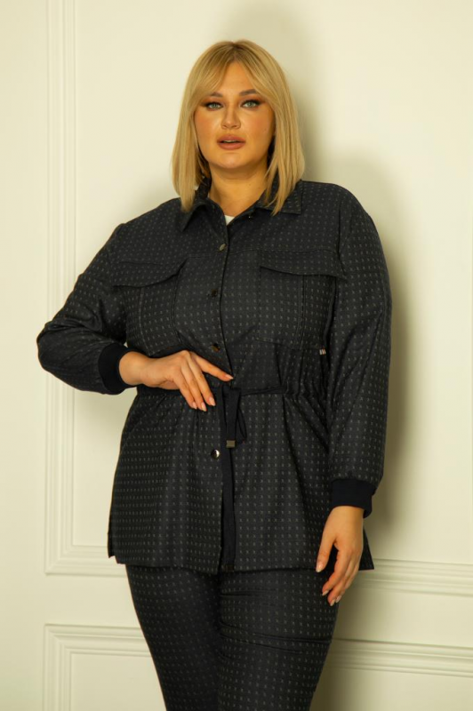 Воротник отложной. Застежка на пуговки, имитирующие клепки. Полочка на кокетке, два накладных кармана  с клапанами. По талии круговая кулиска .