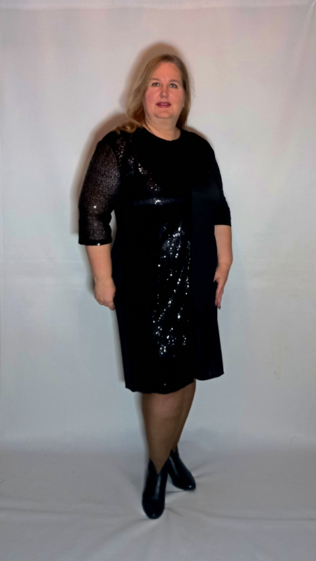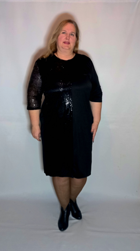 Рукав 3/4 , втачной. С одной стороны из трикотажа, с другой из сетки с пайетками