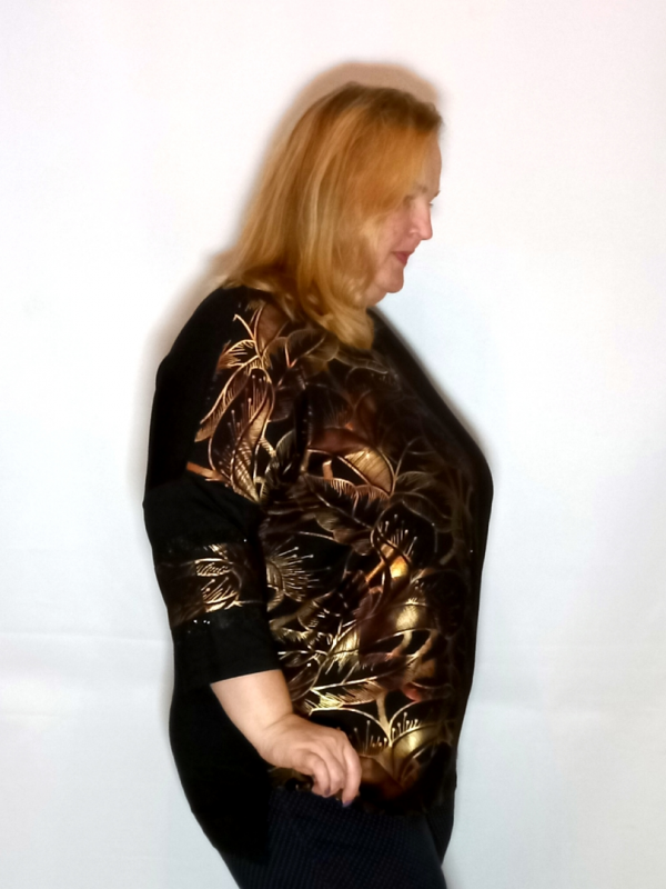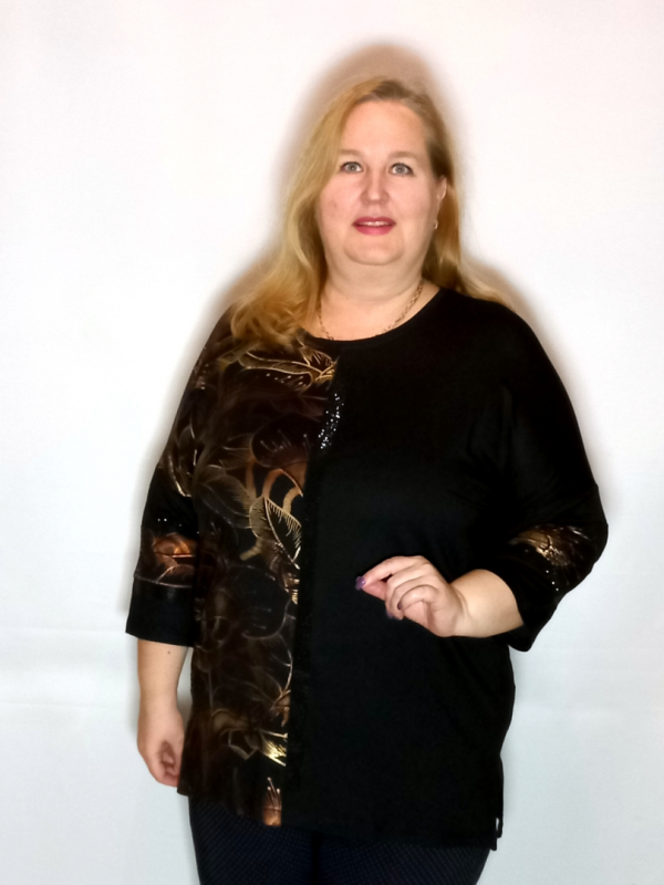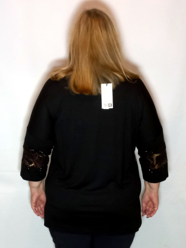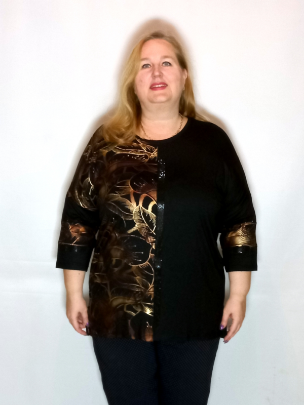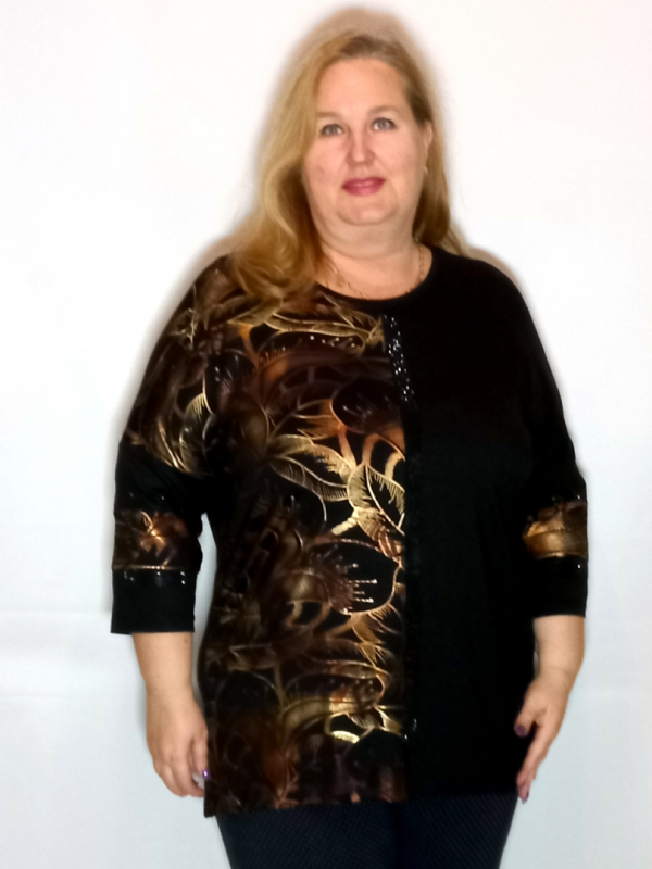 Рукав 3/4, спущенное плечо, декорирован вставкой из трикотажа с принтом и термостразами черного цвета