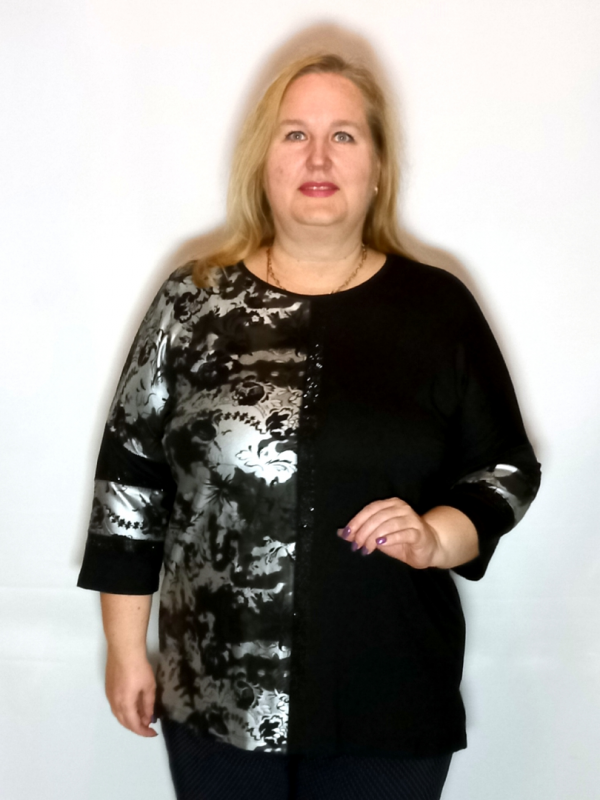 Рукав 3/4, спущенное плечо, декорирован вставкой из трикотажа с принтом и термостразами черного цвета