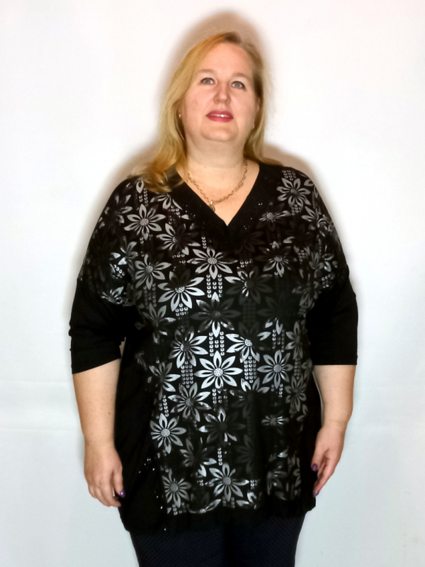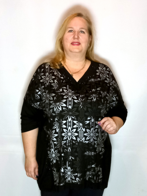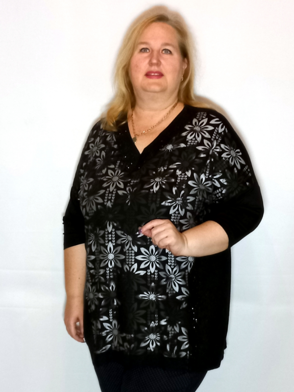 Полочка сложнокроенная: боковые вставки черного цвета, декорированы черными термостразами. Средняя часть полочки из принтованного трикотажа.