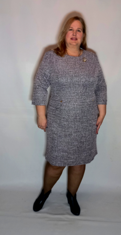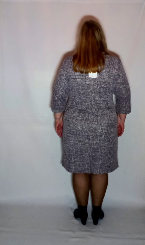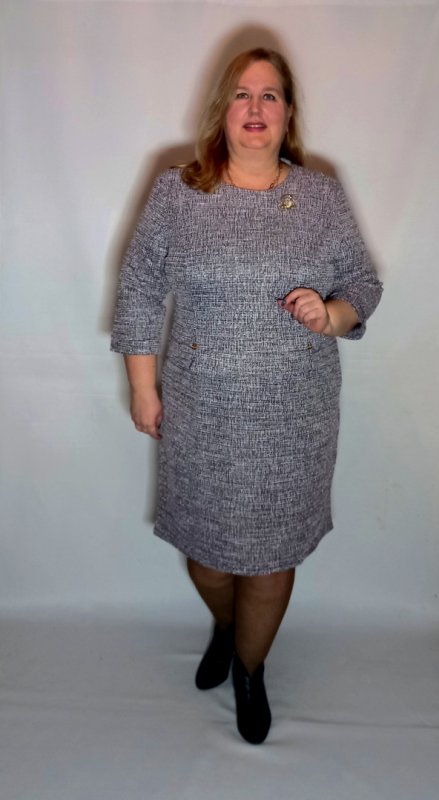 Элегантное  платье выполнено из костюмного букле. Ткань хорошо держит форму, не рыхлая, но и без "заломов". Приятная, мягкая, умеренно эластичная.